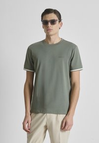 Muškarac u bež majici kratkih rukava s bijelim obrubom na rukavima i logotipom "MORATO" na prsima, u kombinaciji sa sivim hlačama.