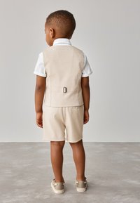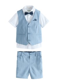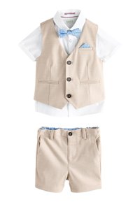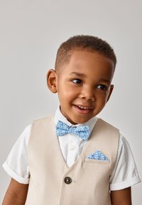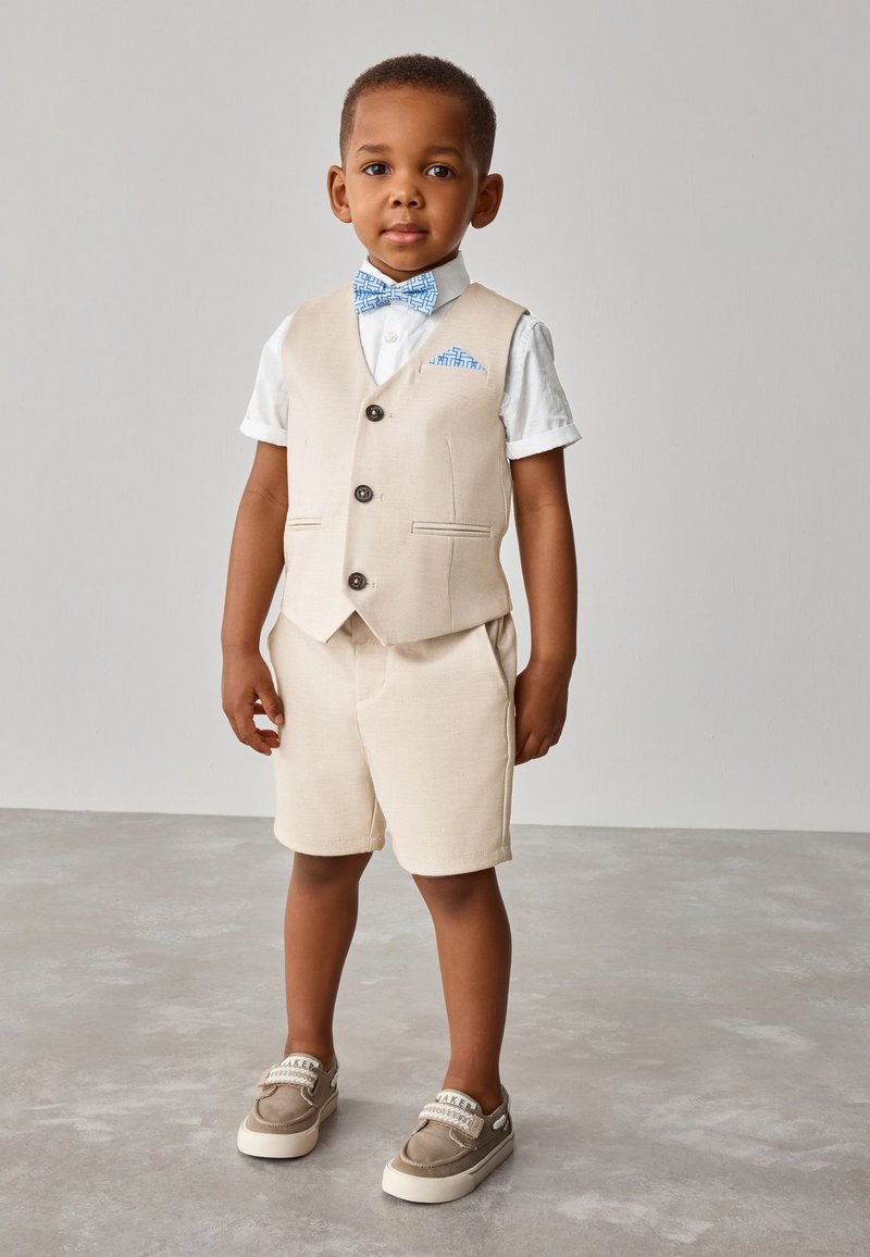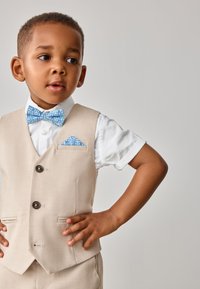 Mladi dječak nosi bež prsluk i kratke hlače, bijelu košulju kratkih rukava, plavu mašnu s uzorkom i rupčić u džepu, stoji na sivom podu.