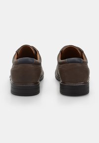 Smeđa kožna cipela s vezicama, zaobljenim vrhom, teksturiranom završnom obradom i kontrastnom crnom petom. Suptilan detalj šavova duž gornjeg dijela.