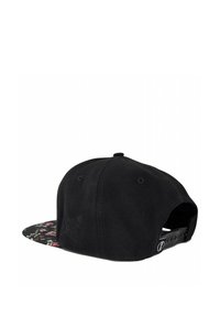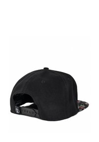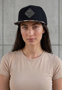 Crna kapa s čvrstim tijelom, koja ima teksturiranu kožnu oznaku i obod s cvjetnim uzorkom u nijansama ružičaste i zelene.