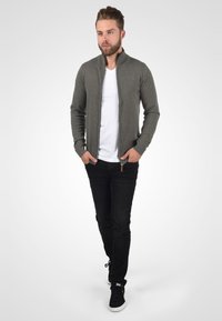Sivi zip-up pleteni kardigan s teksturiranim materijalom, dva prednja džepa i rebrastim manžetama. Nošen preko bijele majice, s opuštenim krojem.