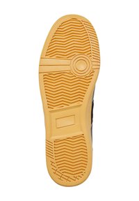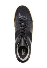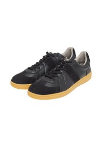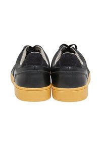 Crne atletske cipele s glatkom kožom i nubuk akcentima, zaobljenim vrhom, vezicama i teksturiranom gumiranom potplatom u smeškastoj boji.