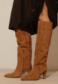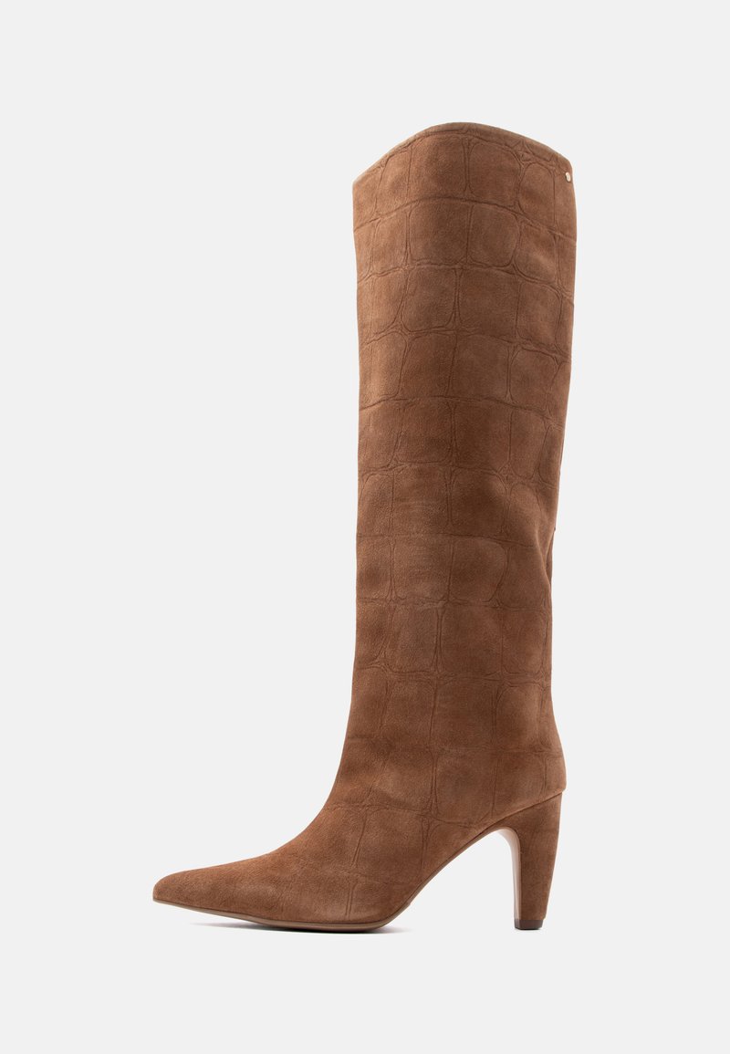 Smeđa brušena koža čizma do koljena sa špicastim vrhom, blok petom i suptilnim utisnutim uzorkom krokodilske kože na bijeloj pozadini.