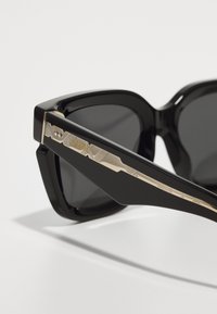 Crne sunčane naočale kvadratnog oblika s debelim okvirom, tamnim staklima i metalnim detaljima na slijepim sljepoočnicama imaju jedinstveni geometrijski dizajn.