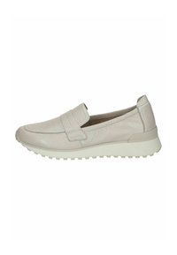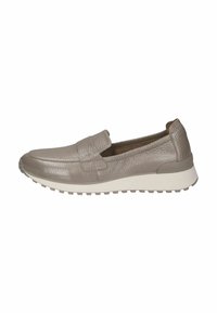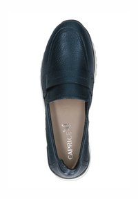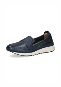 Tamno plava kožna cipela bez vezica s teksturiranim gornjom dijelom, koja ima podignuti šav detalj i bijelu gumenu potplat s teksturiranim uzorkom.