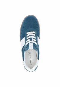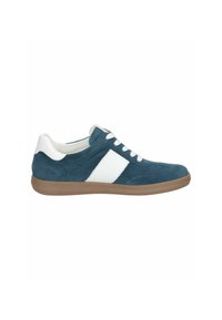 Plava tenisica od brušene kože s bijelim prugama, ima gumeni potplat, vezanje na vezice i teksturirani gornji dio. Okrugli vrh i podstavljeni ovratnik za udobnost.