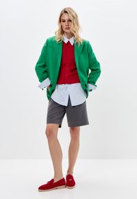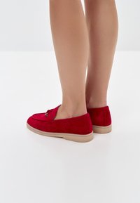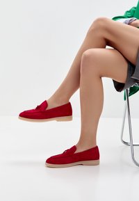 Noge prekrižene, odjevene u sive hlačice i crvene antilop mokasine s bež potplatima i malim ukrasnim resicama.