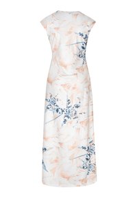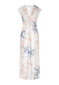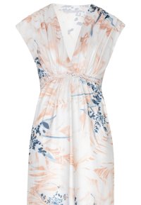 Žena s valovitom plavom kosom nosi bijelu cvjetnu haljinu, stojeći pored velikih zelenih tropskih biljaka na svijetloj zidnoj pozadini.