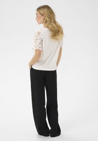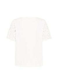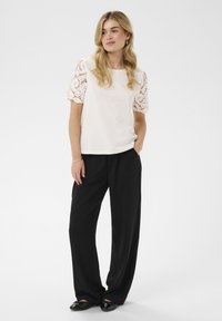 Plava žena u bijeloj majici s čipkastim kratkim rukavima i crnim hlačama stoji s rukama u džepovima na jednobojnoj pozadini.