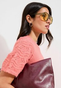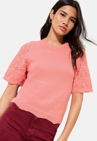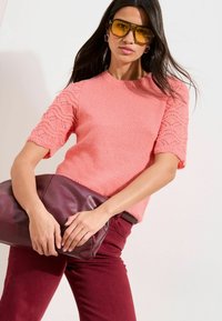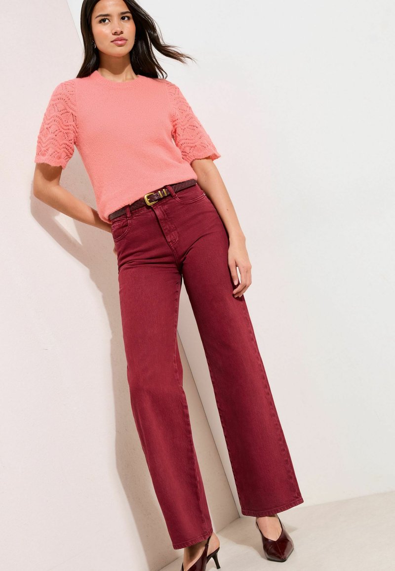 Roza pleteni top s teksturiranim kratkim rukavima, upareni s visokim strukom tamnoljubičastih traperica i cipelama na visoku petu. Jednostavan remen kao naglasak u struku.