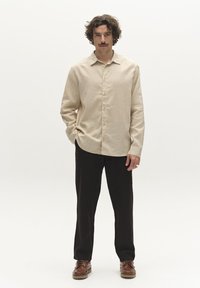 Muškarac u crnim hlačama, bež dugoj košulji i smeđim kožnim cipelama s vezicama stoji na jednobojnoj pozadini.