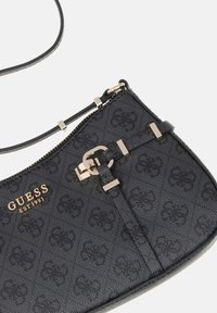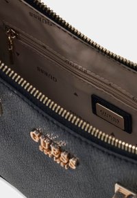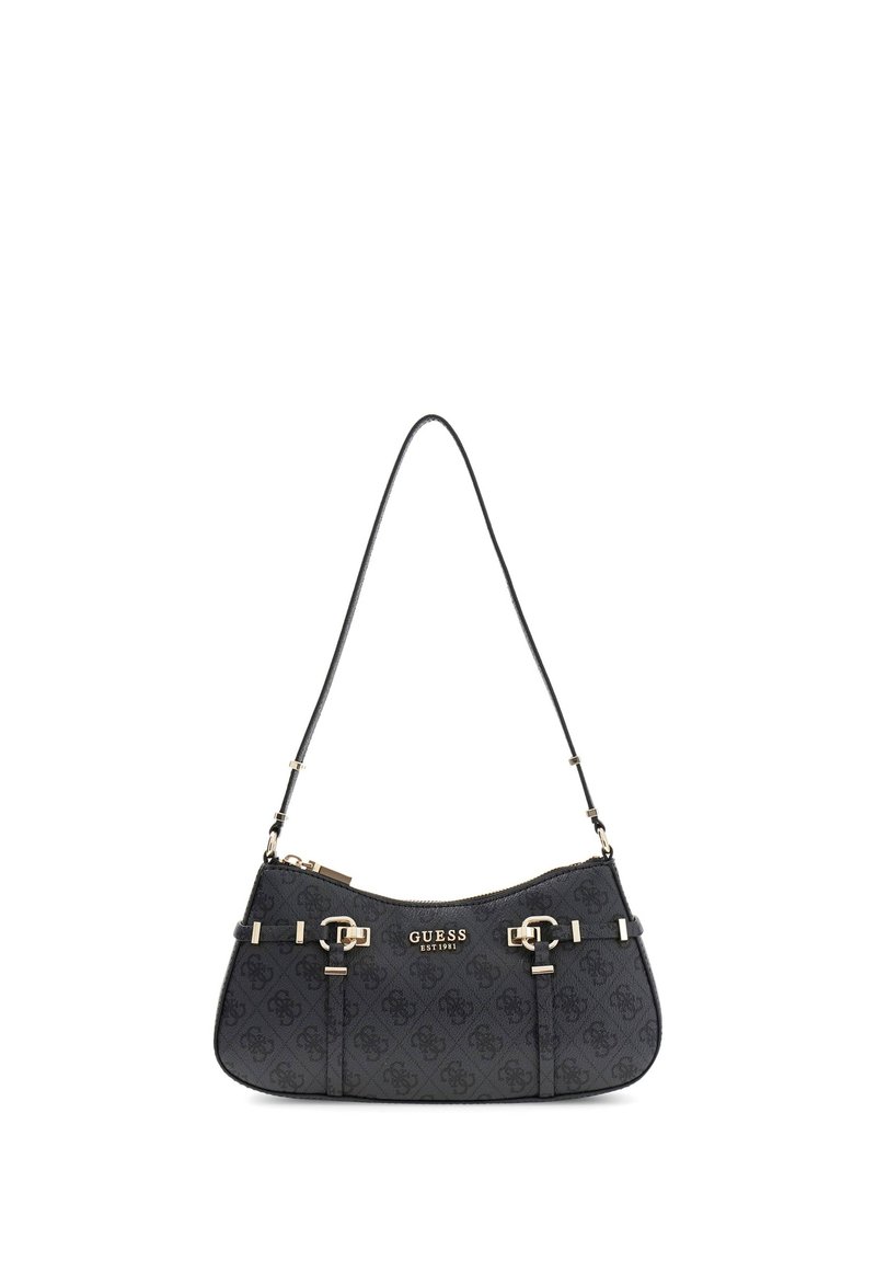 Crna Guess torba za rame s printom logotipa, zlatnim kopčama i tekstom "GUESS EST 1981" sprijeda, s jednom trakicom i zatvaračem.
