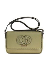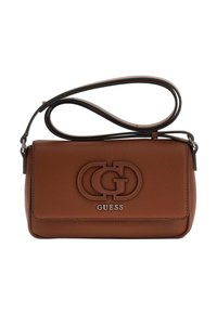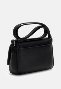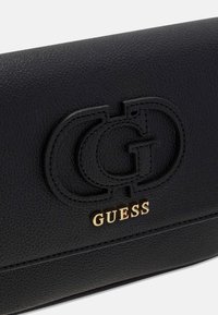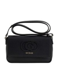 Crna teksturirana kožna Guess torba preko ramena s preklopnim zatvaračem, podesivim remenom i utisnutim logotipom sprijeda.