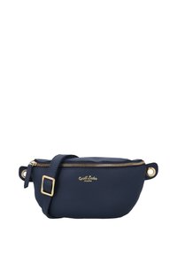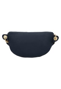 Morska kožna torba preko tijela s teksturiranom površinom, zlatnim patentnim zatvaračem i podesivim remenom. Kompaktni, zakrivljeni dizajn, smješten na struku.