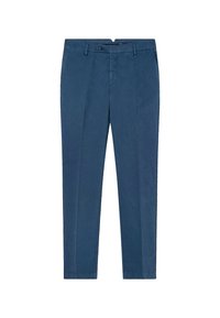 Muškarac obučen u tamnoplave uske hlače, bijelu košulju i bijele tenisice stoji nasuprot jednobojnoj pozadini.