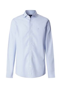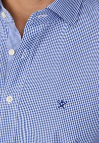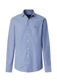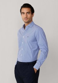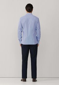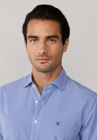 Muškarac u plavoj i bijeloj kariranoj košulji s dugim rukavima, uvučenoj u tamnoplave hlače, stoji nasuprot jednostavne pozadine.