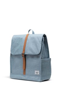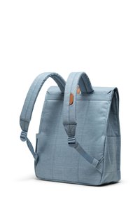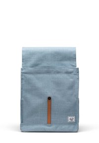 Plava platnena ruksak s preklopom, smešani kožni remen i metalnom kopčom. Ima malu oznaku loga sprijeda.