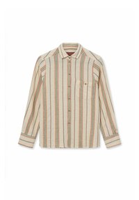 Mlada žena s valovitom kosom, odjevena u bež i plavo prugastu košulju na kopčanje i široke bež hlače, stoji ispred jednostavne pozadine.