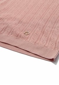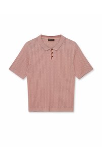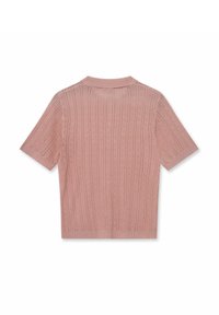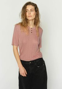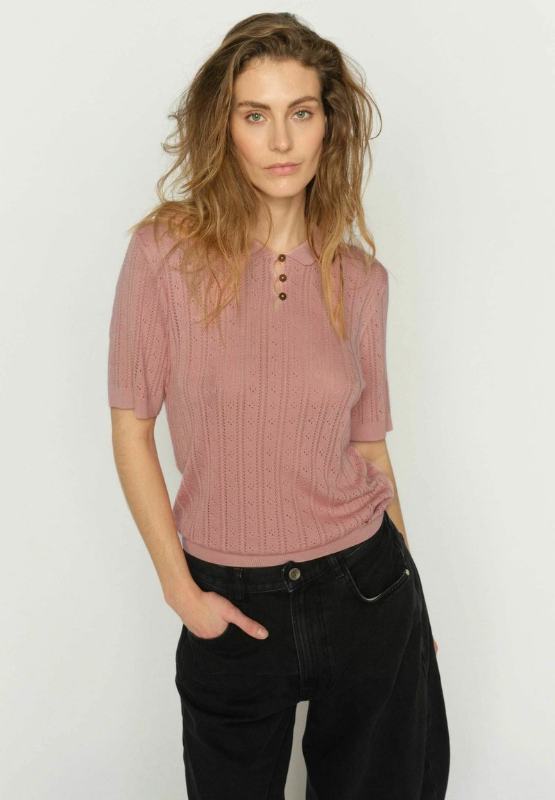 Žena valovite kose nosi ružičastu pletenu polo majicu s kratkim rukavima i visoke crne traperice, sa jednom rukom u džepu.