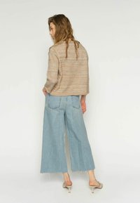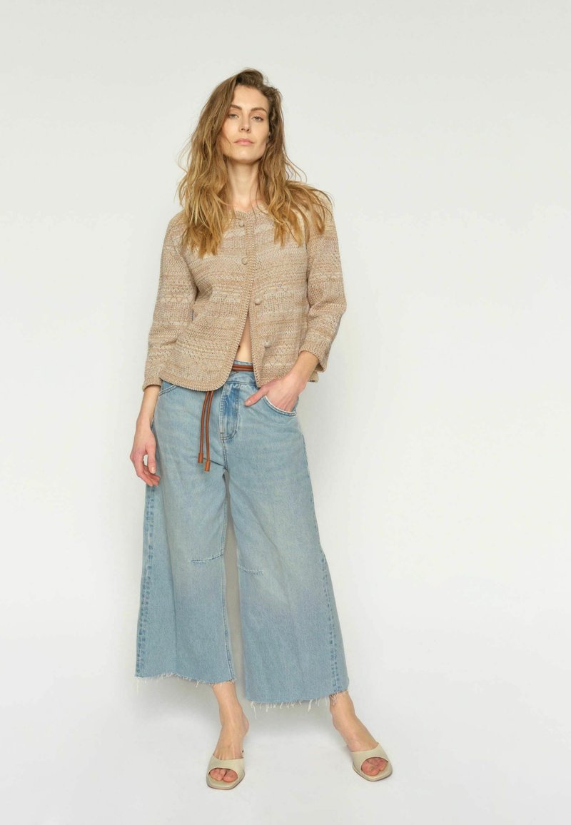 Žena stoji nasuprot bijele pozadine, nosi bež pleteni kardigan, široke svijetloplave traperice krojene do članka s smeđim remenom i bež sandale otvorenih prstiju.