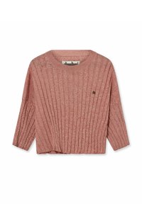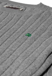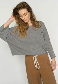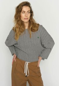 Žena s dugom valovitom kosom, odjevena u sivu rebrastu majicu i smeđe hlače s vezicom, s rukama u džepovima, gleda u stranu na jednostavnoj pozadini.