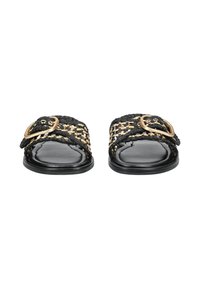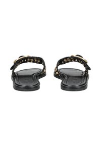 Crne natikače s ravnim đonom, od kože, s velikim zlatnim metalnim detaljem na remenu. Glatka tekstura, minimalistički dizajn.