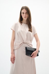 Žena u svijetlo ružičastoj midi haljini s detaljem vezanja u struku, drži crni pismo torbu i nosi crne sandale s potpeticama na bijeloj pozadini.