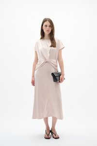 Bež haljina bez rukava midi dužine s vezanjem u struku, koja ima ravnu siluetu i mekanu teksturu. Uparena s bijelim sandalama na remenčiće.