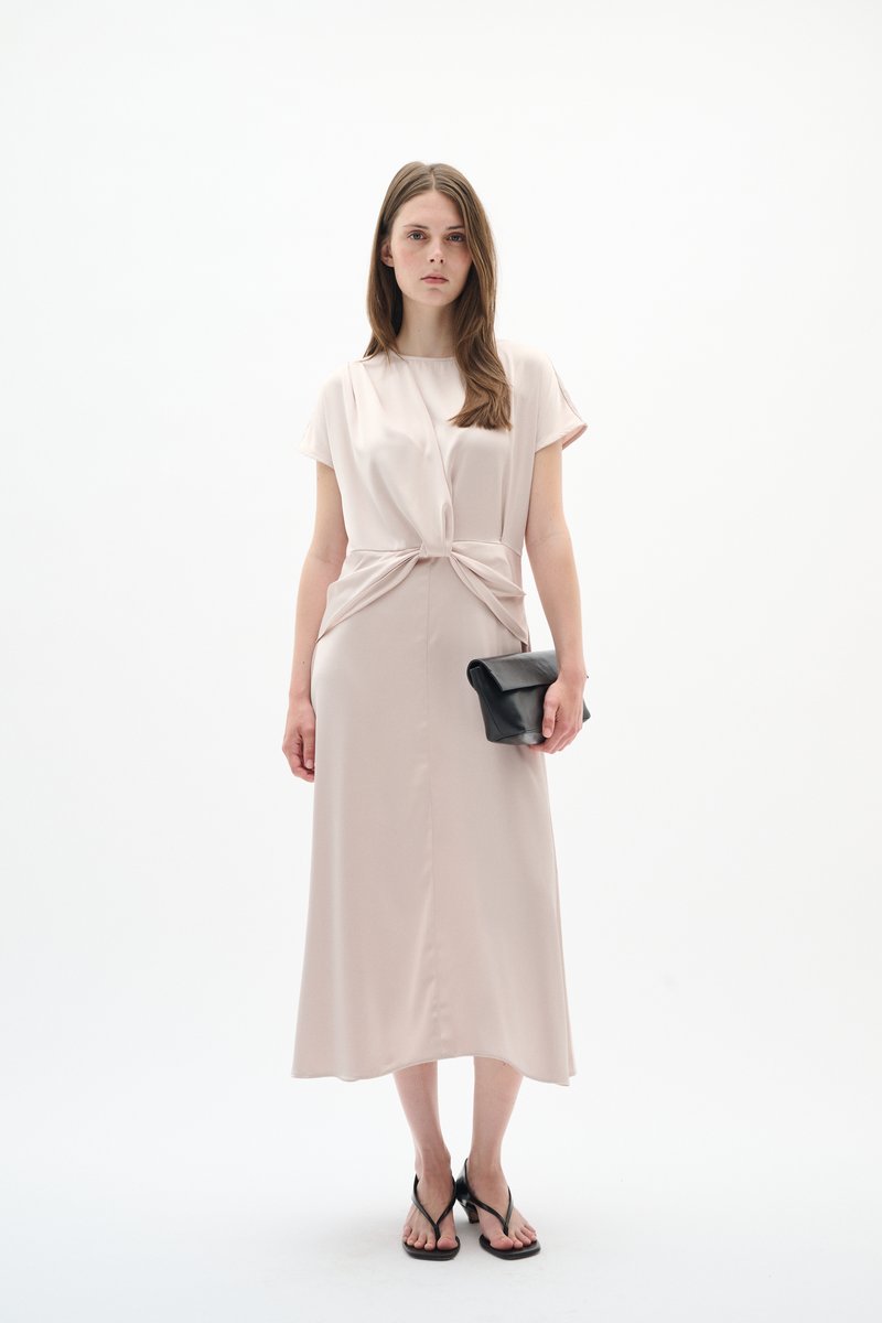 Bež satenasta haljina s kratkim rukavima i ukrasom u obliku čvora na struku, uparena s crnim sandalama s otvorenom petom koje imaju špici.