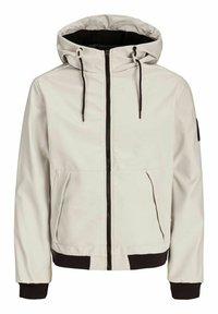 Mladić u maslinastozelenoj jakni s kapuljačom na patentni zatvarač preko kockaste košulje i plavih traperica, gleda u stranu na jednobojnoj pozadini.