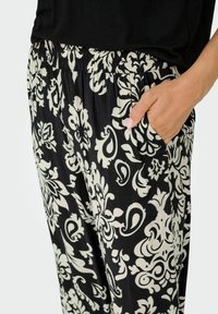 Model nosi crno-bijele široke hlače s cvjetnim damask uzorkom i crne balerinke, ruka u džepu.