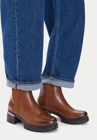 Smeđe kožne gležnjače s elastičnim bočnim panelima, debelom crnom petom i glatkim završetkom, uparene s podvrnutim plavim trapericama.