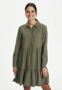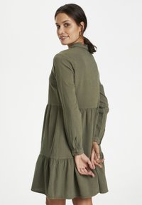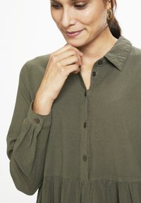 Žena se smiješi, nosi zelenu haljinu dugih rukava s ovratnikom i višeslojnim dijelom suknje, stoji na jednobijeloj pozadini.