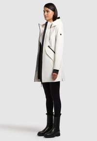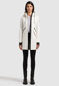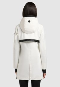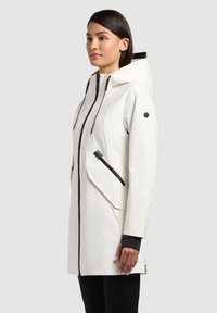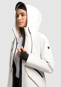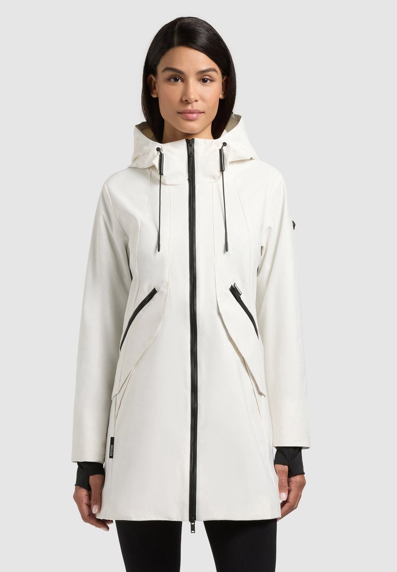 Žena u bijelom kaputu s kapuljačom s crnim detaljima na patentnom zatvaraču i džepovima, stoji na jednostavnoj svijetlo sivoj pozadini.