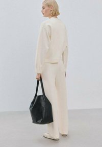 Hlače širokih nogavica od mekog kremastog materijala, s opuštenim krojem i glatkom teksturom. Uparene s odgovarajućim skraćenim topom.