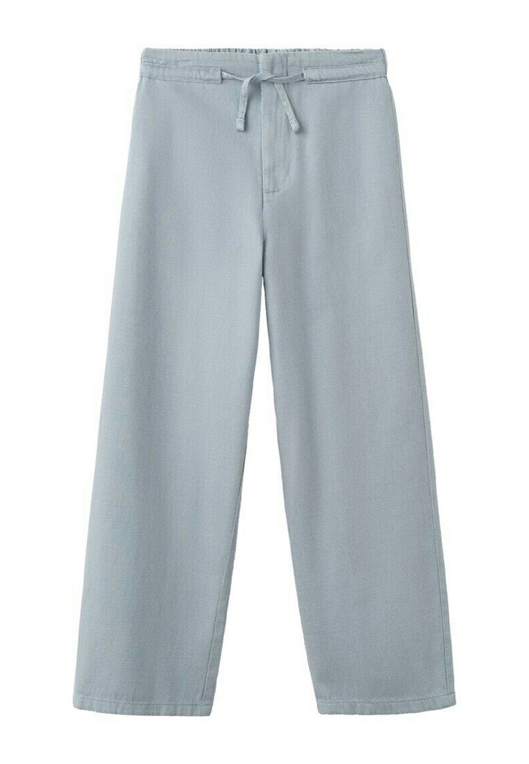 Svijetlosive široke hlače s elastičnim pojasom i vezicom, s ležernim krojem i ravnim rubovima.