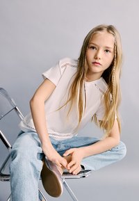 Mlada djevojka stoji, nosi bijelu košulju kratkih rukava, svijetloplave traperice, srebrne baletanke i ogrlicu od perlica na jednostavnoj sivoj pozadini.