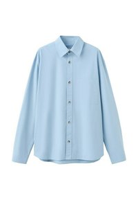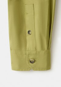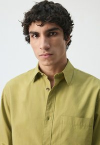 Mladić u dugoj zelenoj maslinastoj košulji s gumbima i crnim hlačama, stoji s jednom rukom u džepu ispred jednobojne pozadine.