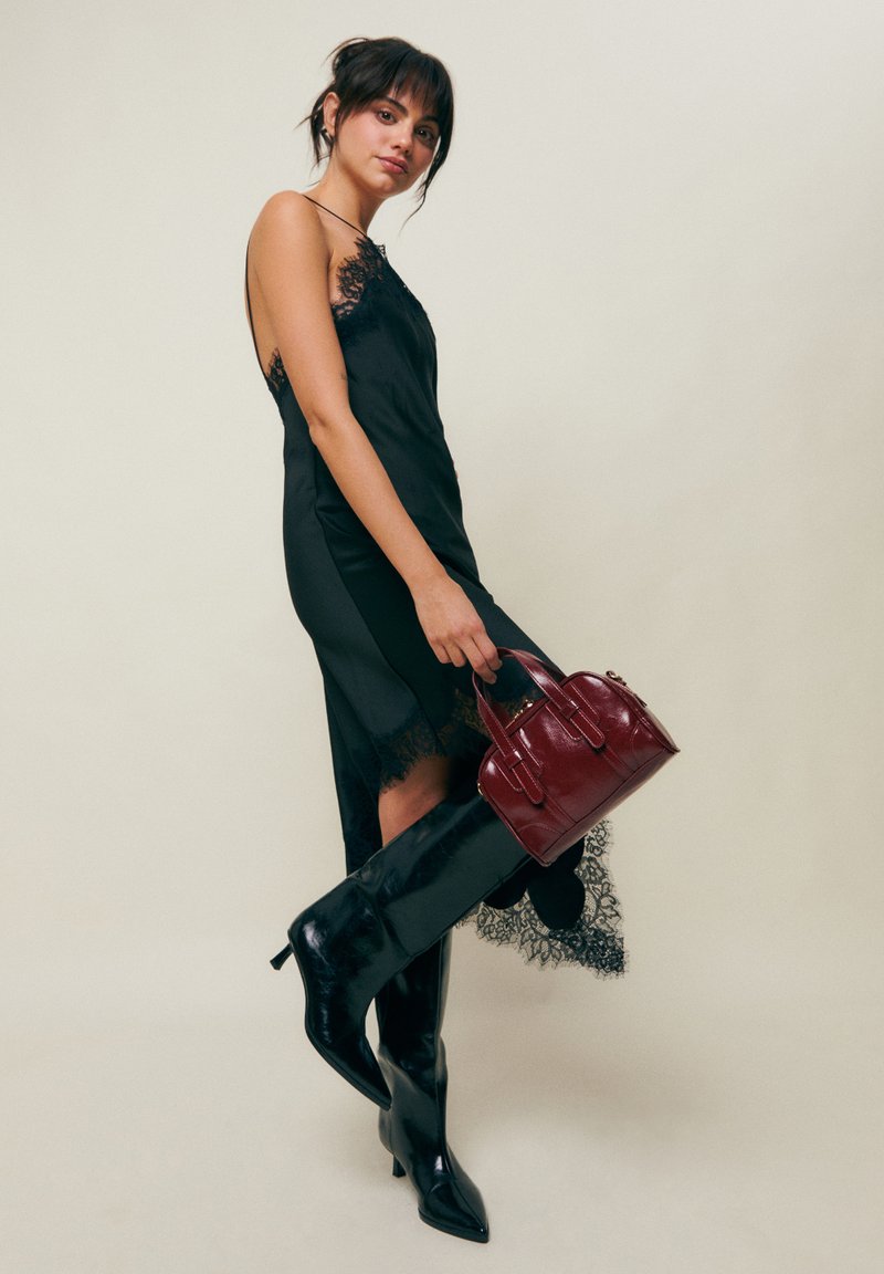 Žena u crnoj haljini od čipke i crnim čizmama do koljena drži malu tamnocrvenu kožnu torbicu na jednostavnoj pozadini.