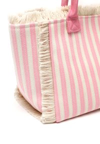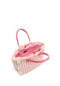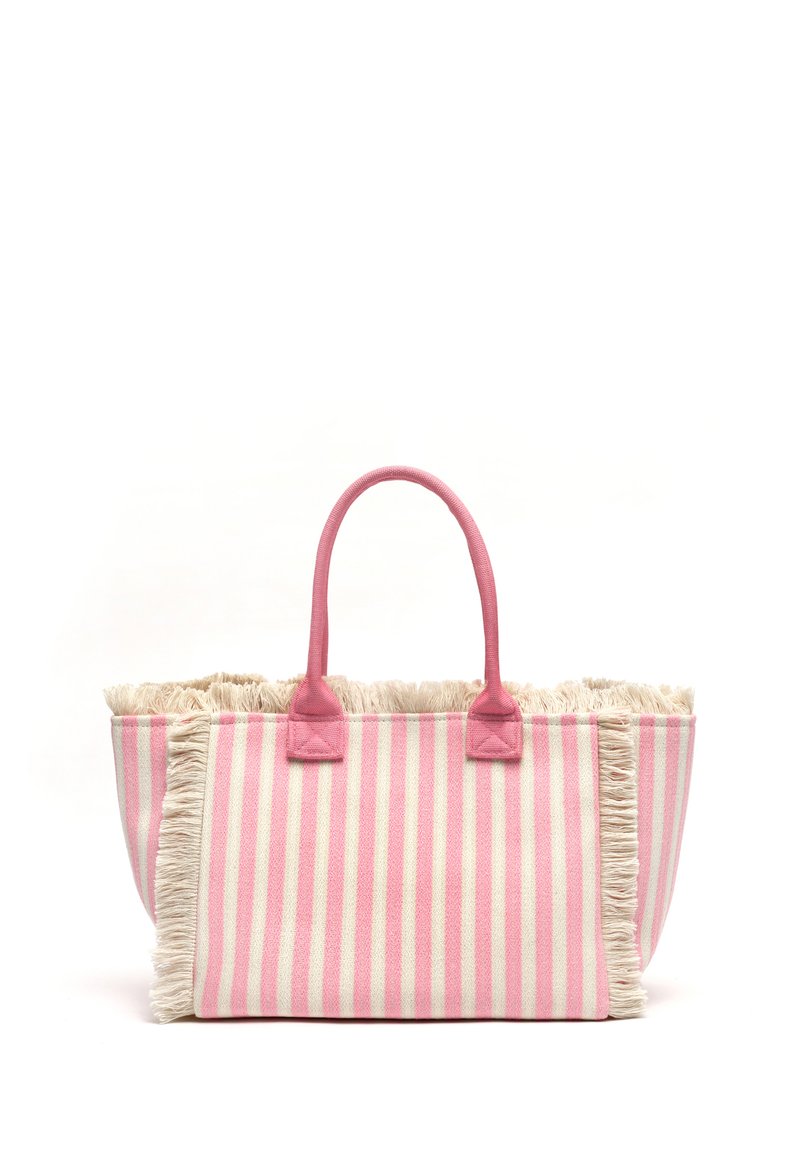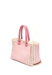 Torba na rame s ružičastim i kremastim prugama, s dvije ružičaste ručke i kremastim resama duž gornjeg ruba i prednjeg panela.