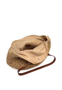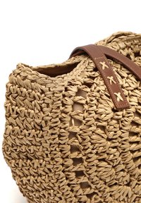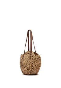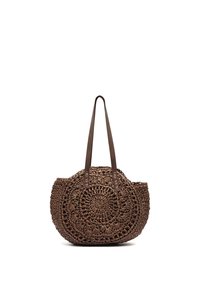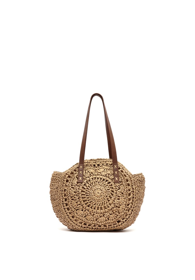 Okrogla pletena torba od slame s smeđim kožnim remenima za rame, s kružnim uzorkom i otvorenim tkanim dizajnom.