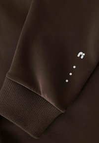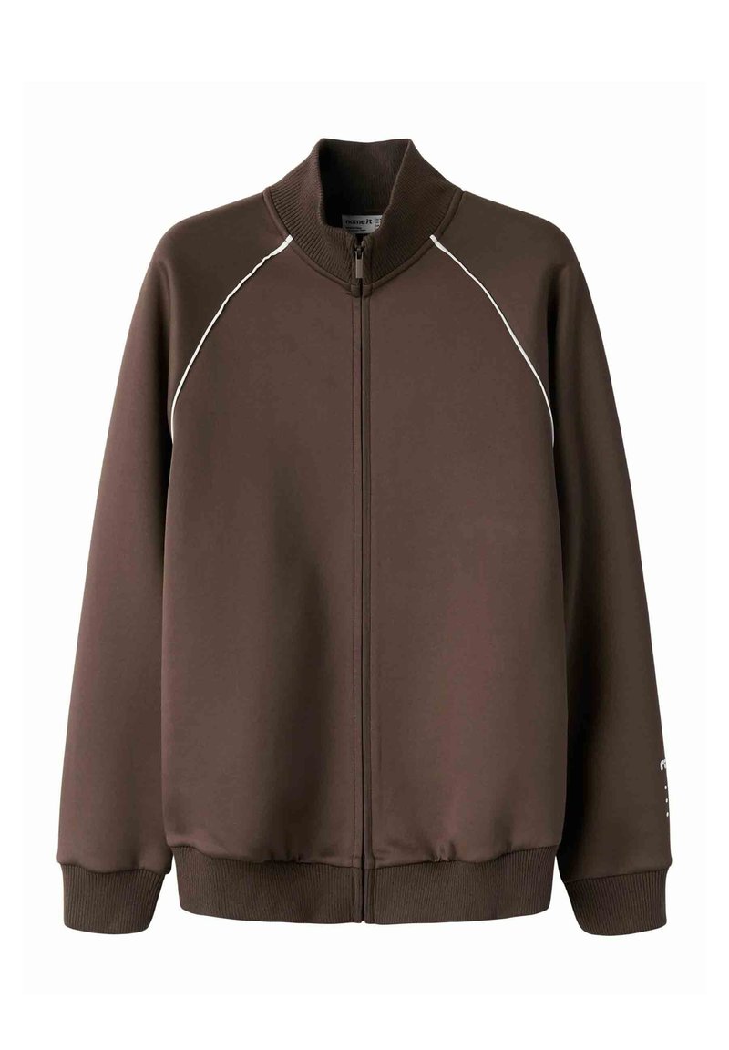 Smeđa trenirka s punim patentnim zatvaračem, rebrastim ovratnikom, manšetama i rubom, s bijelim ukrasnim trakama duž šavova ramena.