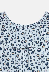 Mlada djevojka smiješi se, nosi svijetloplavi kombinezon s leopardovim uzorkom i volančićima na izrezu te svijetloplave sandale, stoji na bijeloj pozadini.