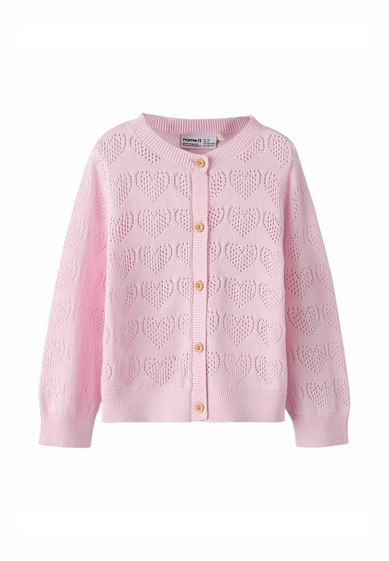 Svijetloružičasti pleteni kardigan s uzorkom srca u obliku rupica i pet drvenih gumba na prednjoj strani, dugim rukavima te rebrastim rubovima na manžetama i rubu.