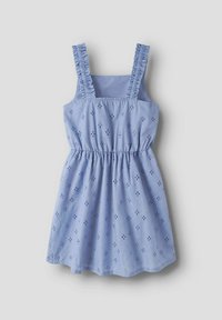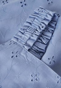 Haljina svijetloplave boje bez rukava s naboranim trakama, elastičnim pojasom i vezanim uzorkom cvjetnih prozora na cijelom tkanju.