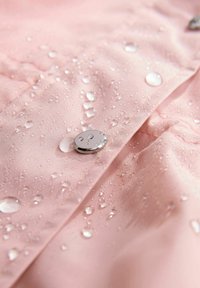 Svjetloružičasti kišni kaput s kapuljačom, kopčama na drukere, elastičnim manšetama i dva bočna džepa. Izrađen od glatkog, vodootpornog materijala.