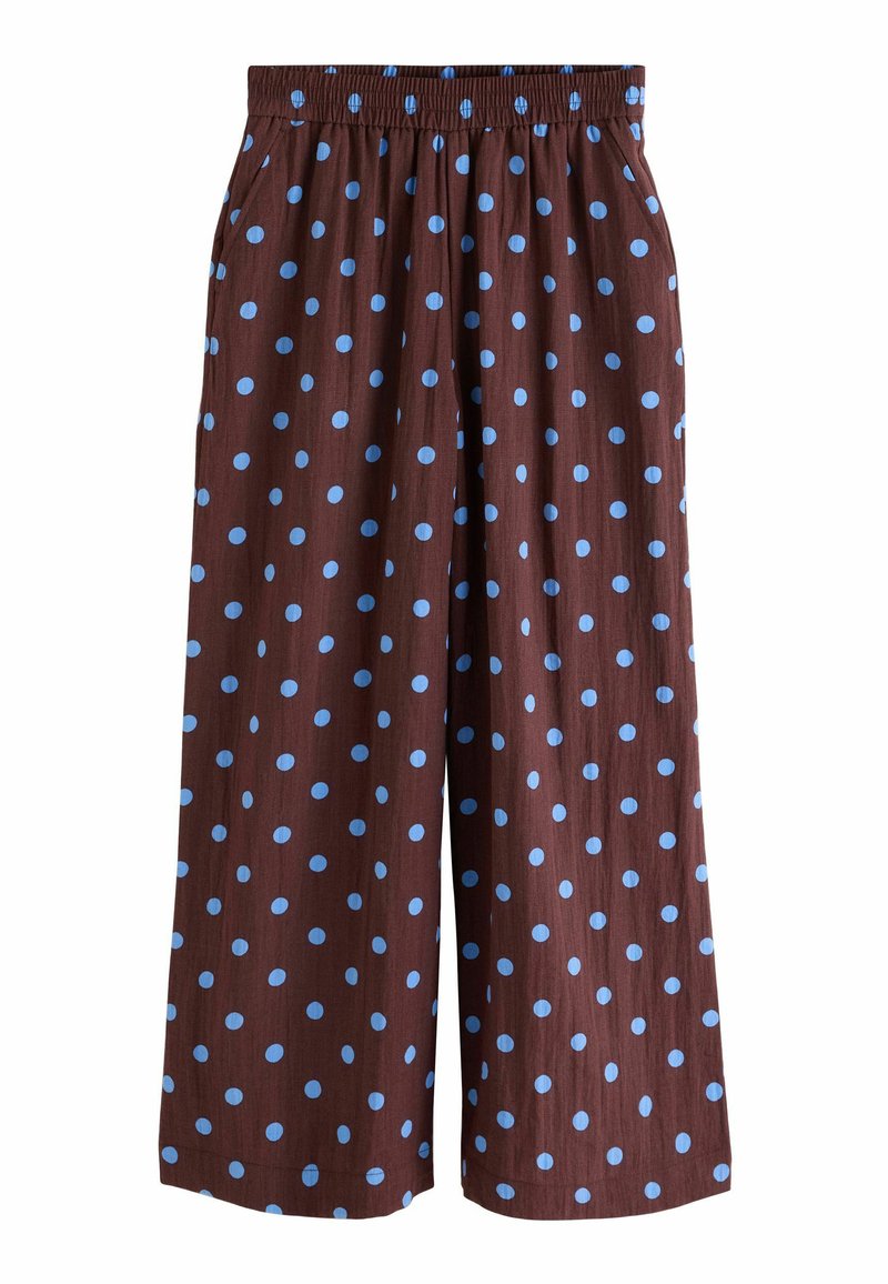 Smeđe široke hlače s gumenim remenom u svijetloplavim točkicama, naborima sprijeda i bočnim džepovima.