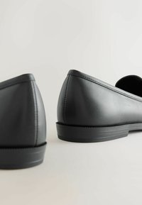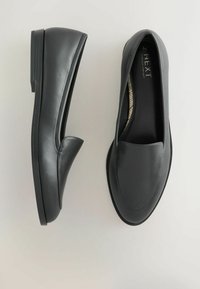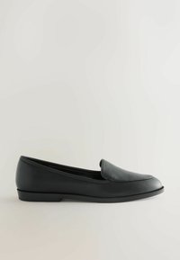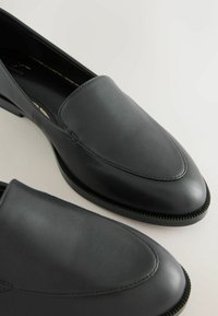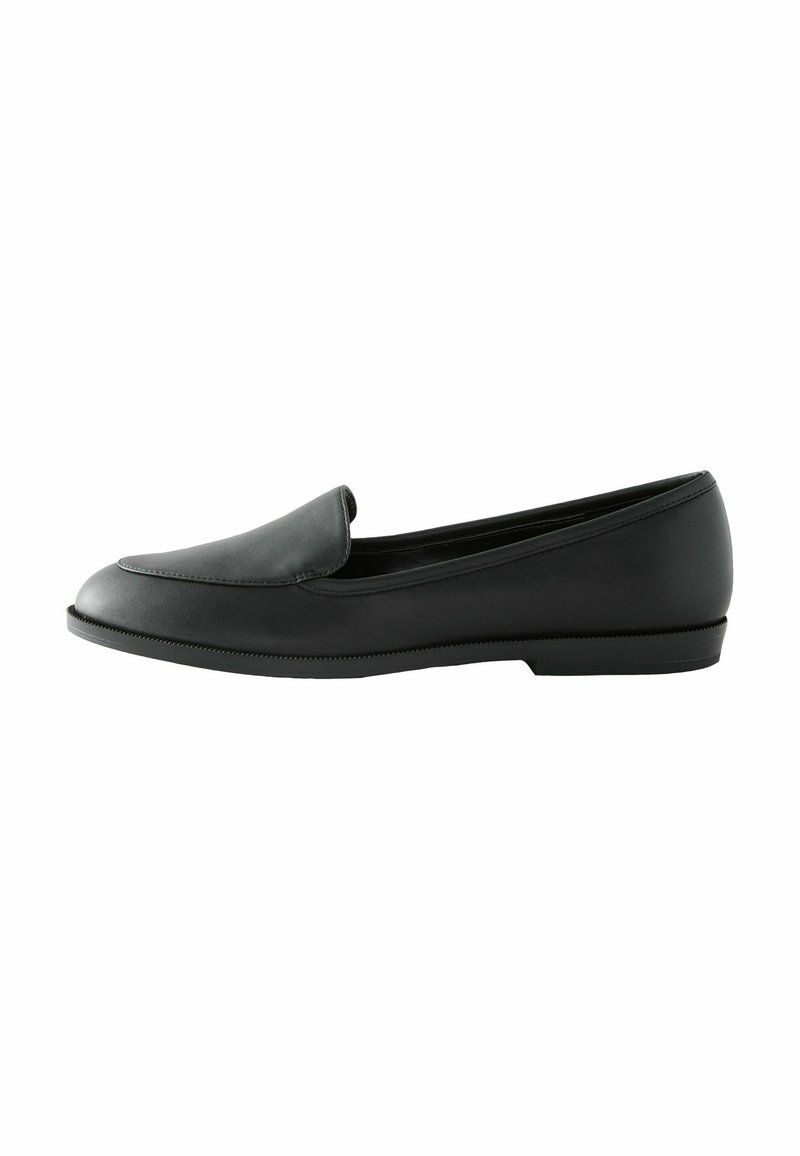 Crni kožni mokasin s glatkom teksturom, niskom potpeticom i dizajnom za lako obuvanje. Ima zaobljeni vrh i minimalno šivanje za čist izgled.