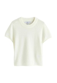 Džemper s kratkim rukavima i okruglim izrezom u jarkoj žutoj boji. Mekana tekstura s urednim pletenim uzorkom; blago opušteni kroj, ravni rub. Vidljiva oznaka marke.
