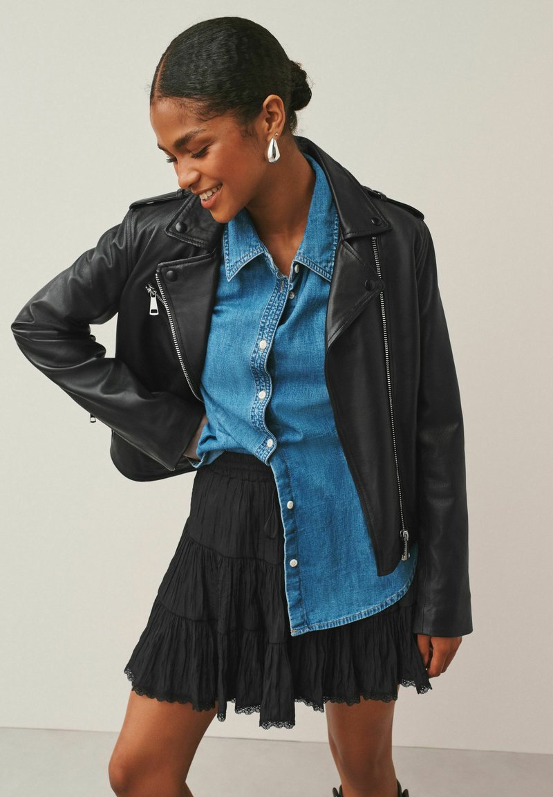 Žena koja se smiješi, nosi srebrne naušnice u obliku obruča, crnu kožnu jaknu preko plave traper košulje s gumbima i crnu slojevitu suknju.